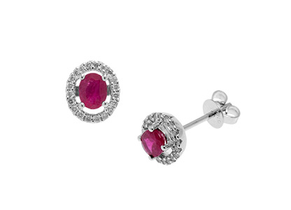 City of London Jewellers present these gorgeous 18ct White Gold Ruby & Diamond Stud Earrings each Set with a single oval ruby centre, with a halo of bright sparkling round diamond.