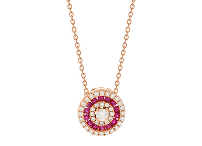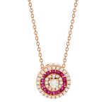 A single, round sparkling brilliant cut diamond centre stone, with a further two halos of diamonds, encasing an exquisite halo of beautiful rich red rubies, all in gorgeous 18ct rose gold settings, with a matching rose gold chain.