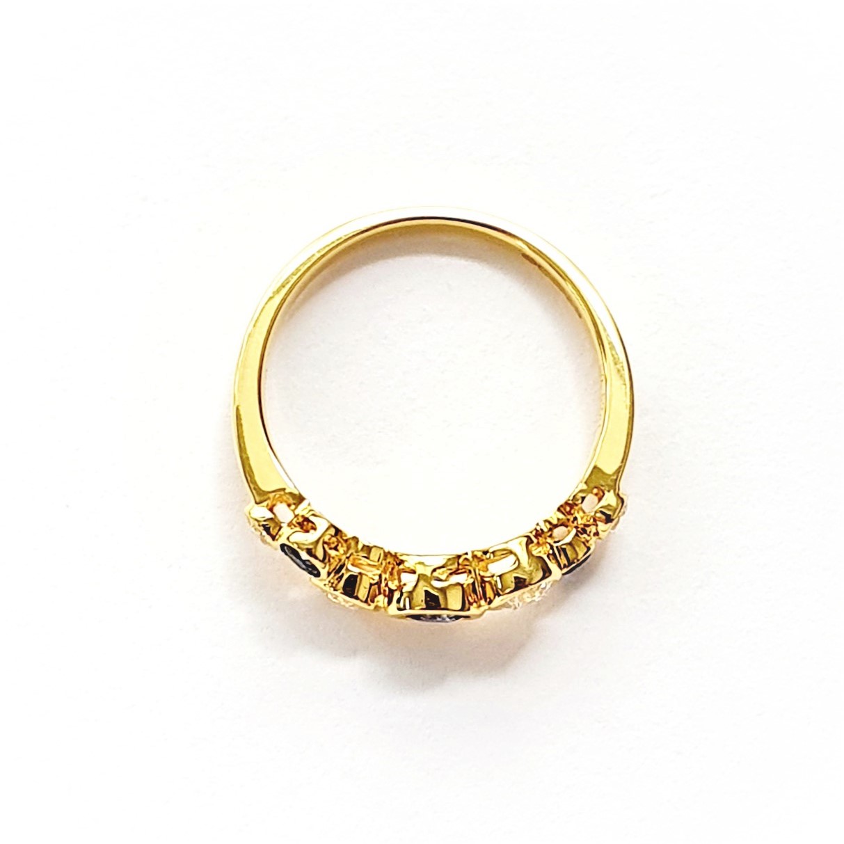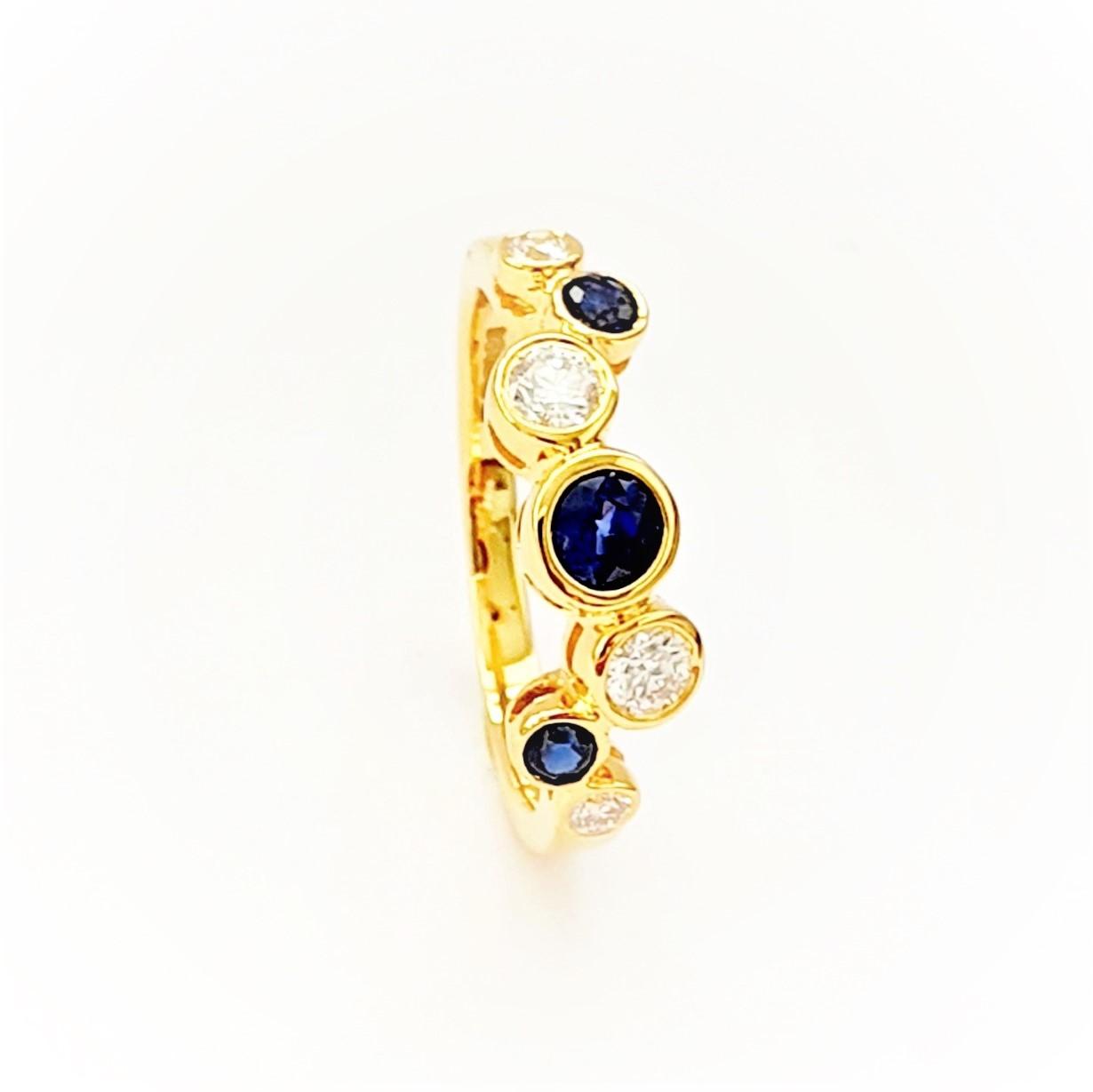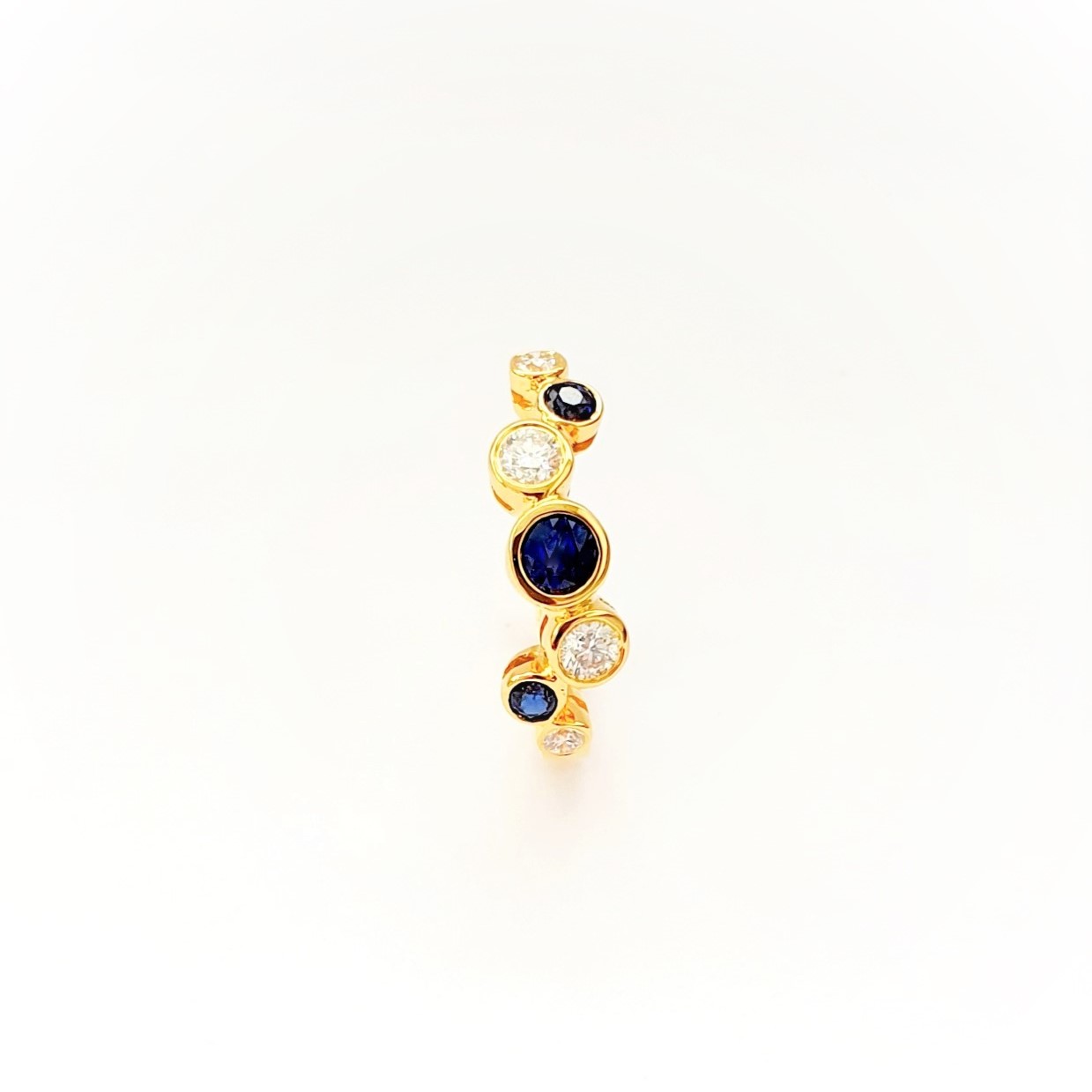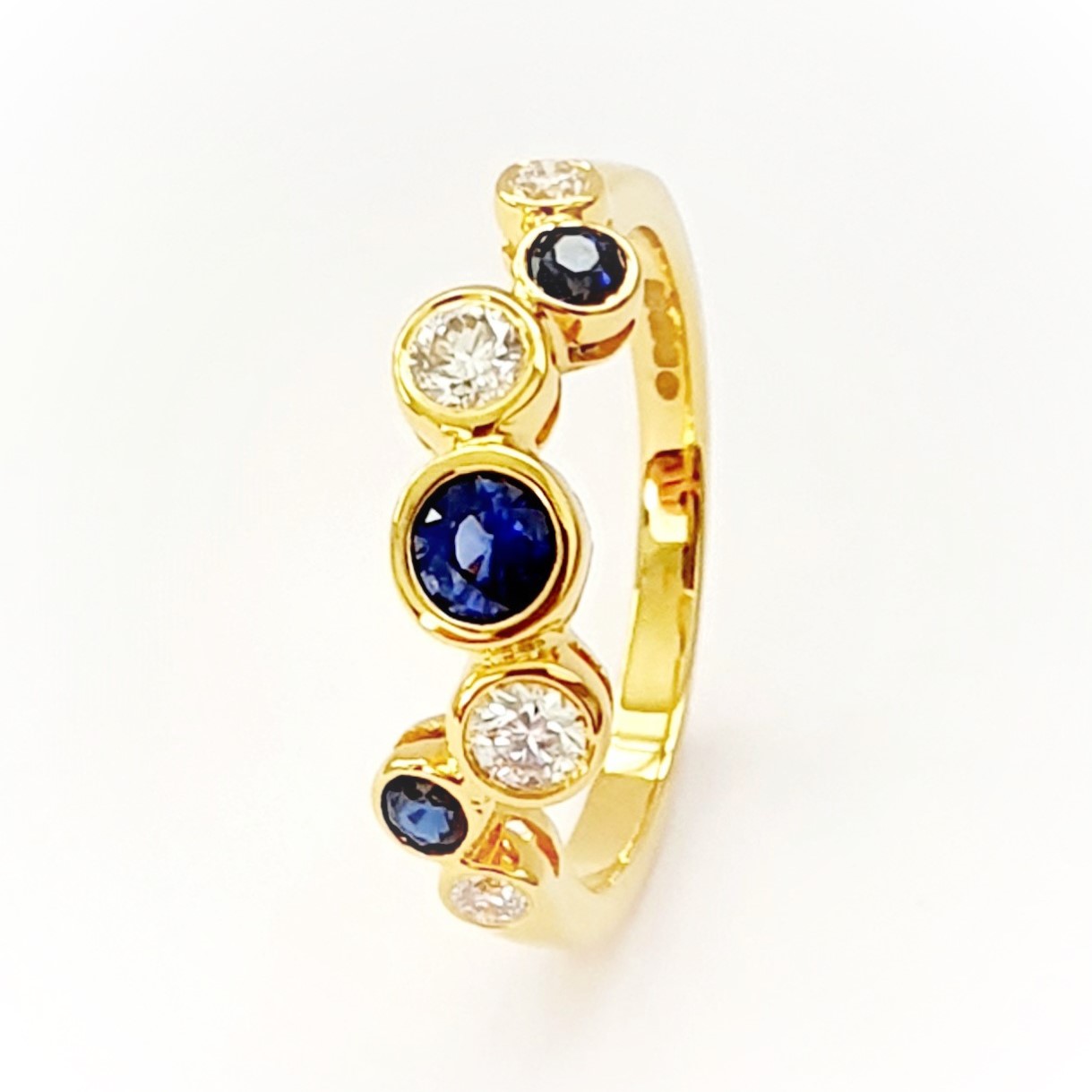 This fascinating 18ct yellow gold ring is a captivating and unique design, set with four scattered round brilliant cut white diamonds and three blue sapphires of varying sizes. A ring with compelling luxurious appeal that will be adored for years to come, and is sure to become a favourite addition to your collection.