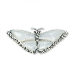 This beautiful butterfly brooch is finely crafted to the highest standard from real silver. The wings are carved from mother of pearl and Set with round marcasite’s to the centre and lower edge with two petite garnet colour red eyes.
