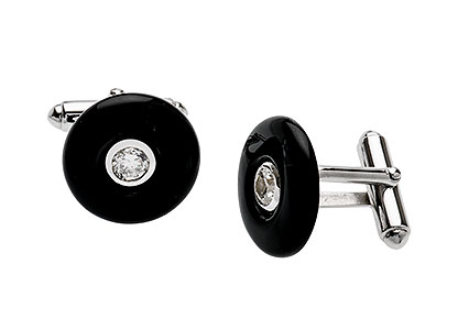 These cufflinks have a beautifully tactile smooth black doughnut shape inlaid to the centre with one round sparkling white cubic zirconia.