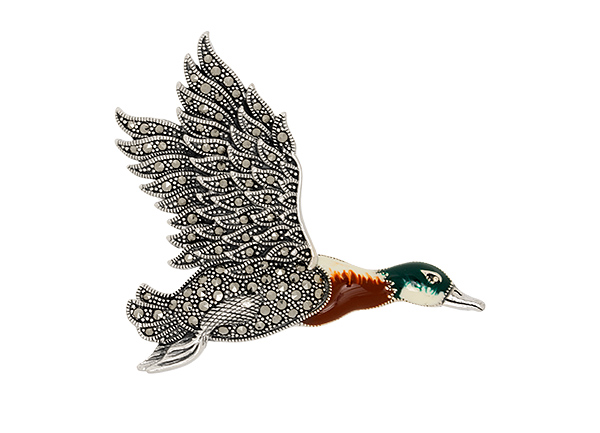 City of London Jewellers present the Huddersfield Silver Marcasite Flying-Duck Brooch, Crafted in Real Starling Silver with Enamel and Marcasite.