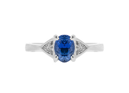 City of London Jewellers present’s the Royal Tunbridge Wells 18ct White Gold Oval Sapphire and Triangular Diamond Three Stone Ring.