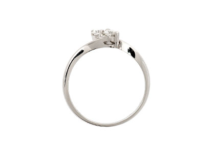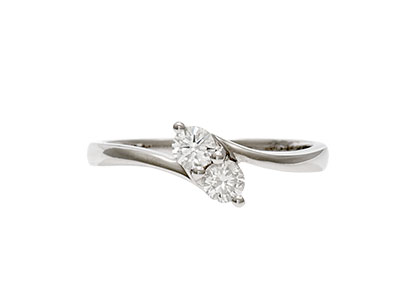 Luxurious and elegant, this stunning 18 carat white gold two stone diamond crossover ring is perfectly accentuated by the deep lustre of the polished white gold. The two round brilliant cut diamonds, set in an unusual four-claw setting, to get the greatest possible light reflection. The diamonds have been perfectly matched and chosen for their exceptional sparkle and fire. This elegant design creates a dramatic, eye-catching effect.