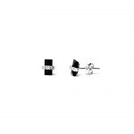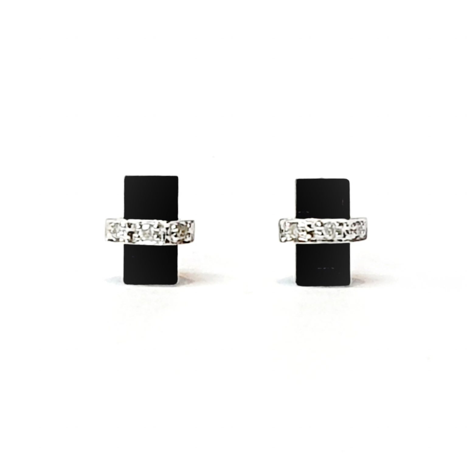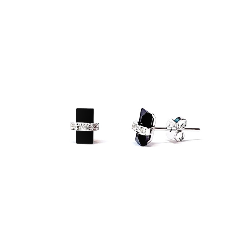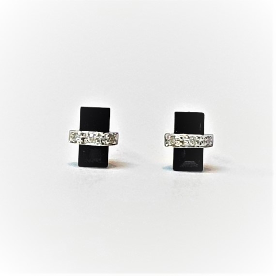 Simply beautiful, these rectangular baguette shaped black stone and diamond stud earrings, create a look that is elegant and graceful. Each stone is wrapped with a single band of white gold set with sparkling white diamonds, giving a dainty feminine look.