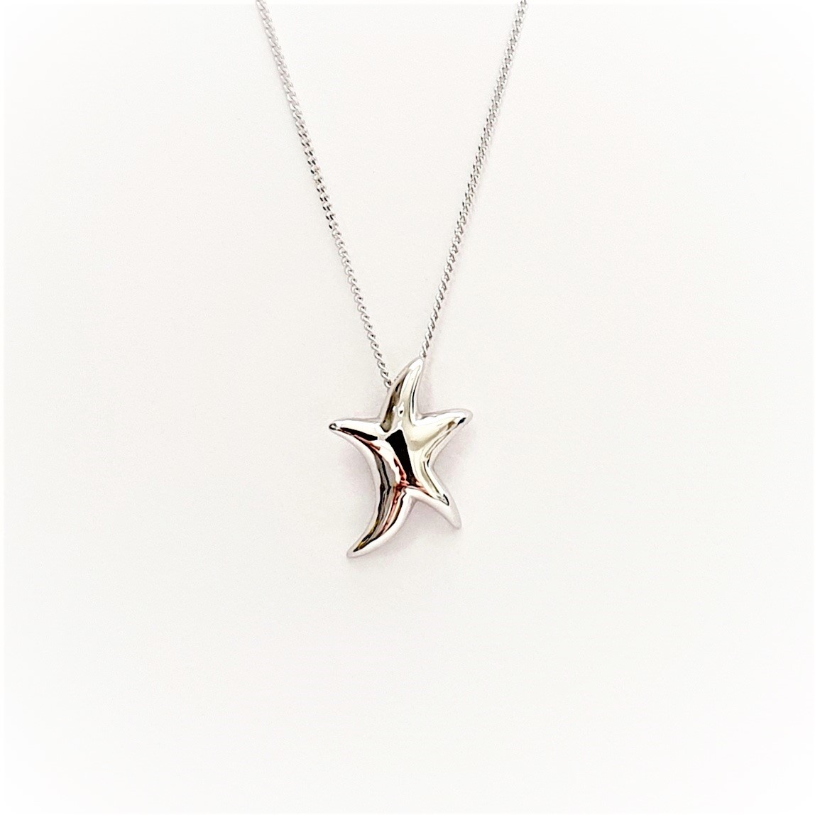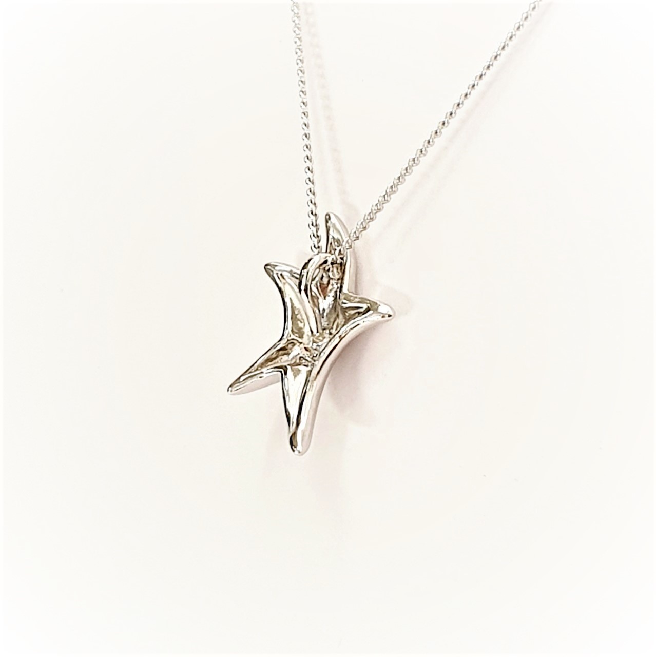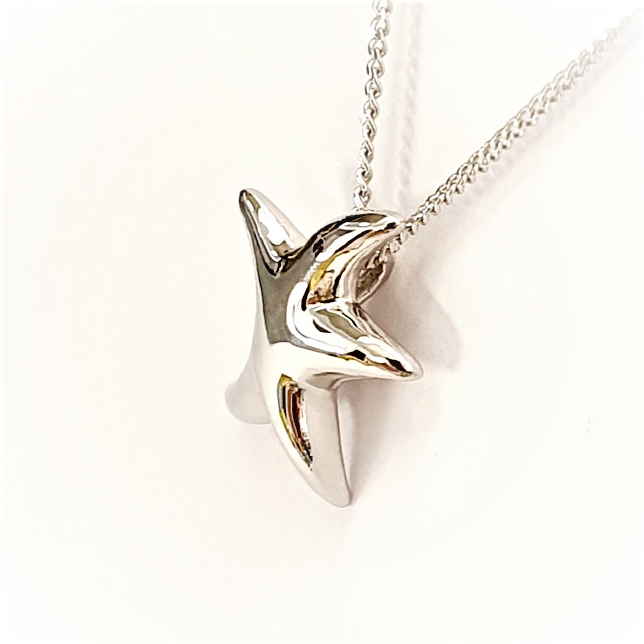 Create starry style with this White Gold Star Necklace. Hand-finished in 9ct white gold and featuring a highly polished finish, this is a subtle design and delicate form with a unique tactile feel. The necklace features an abstract curved starfish pendant with a strong white gold curb link chain. Inspired by the combination of glittering night stars and the organic star fish of the sea, this unusual necklace is perfect for anyone who wants to add the magic of stars to their look.