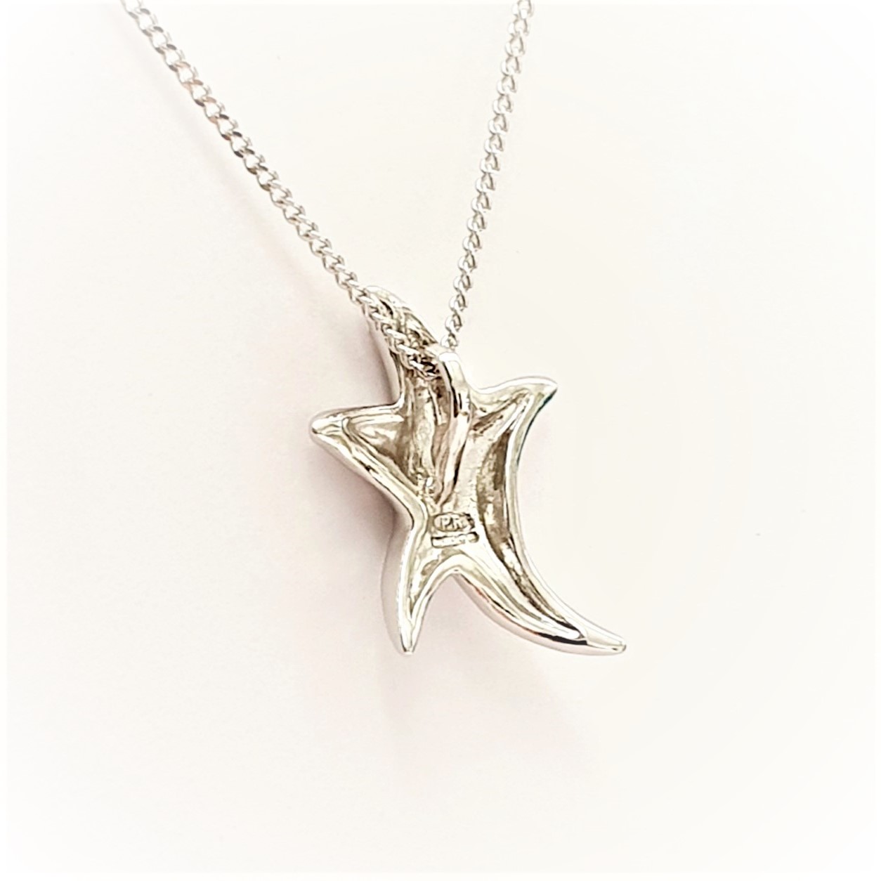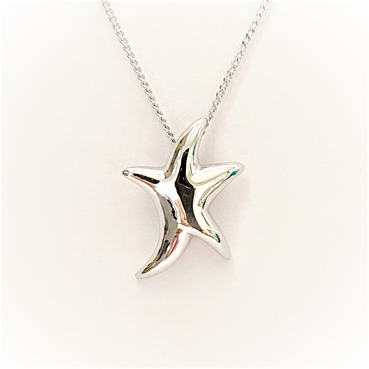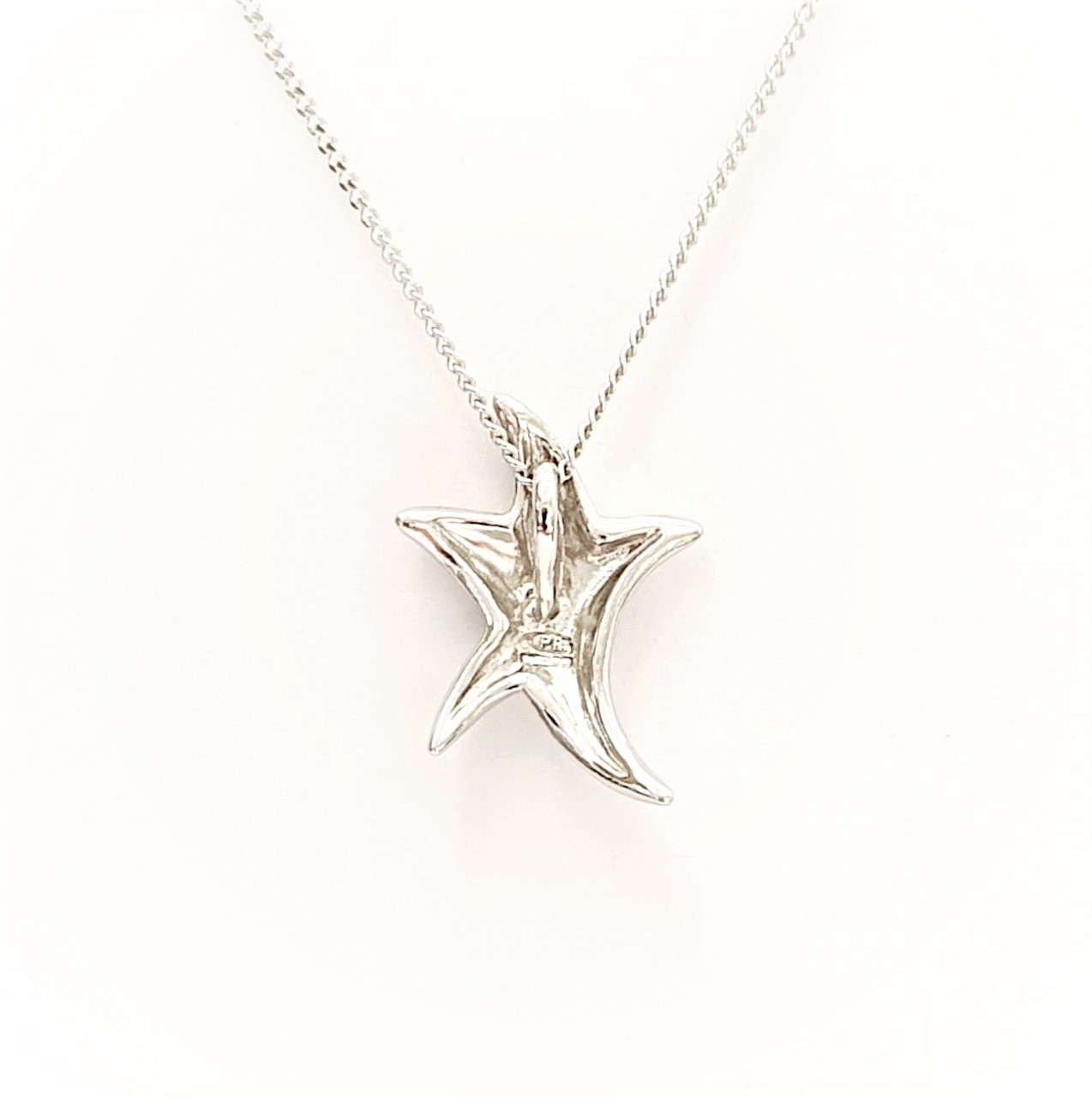 Create starry style with this White Gold Star Necklace. Hand-finished in 9ct white gold and featuring a highly polished finish, this is a subtle design and delicate form with a unique tactile feel. The necklace features an abstract curved starfish pendant with a strong white gold curb link chain. Inspired by the combination of glittering night stars and the organic star fish of the sea, this unusual necklace is perfect for anyone who wants to add the magic of stars to their look.