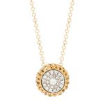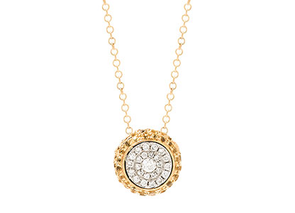 This amazing ball design pendant, is encrusted with white brilliant cut diamonds on a round 18ct white gold disc to the front, set into a yellow sapphire encrusted ball. Supplied with an 18ct yellow gold 16 inch round link trace chain, adjustable to 18inches, which threads through the yellow gold ball.